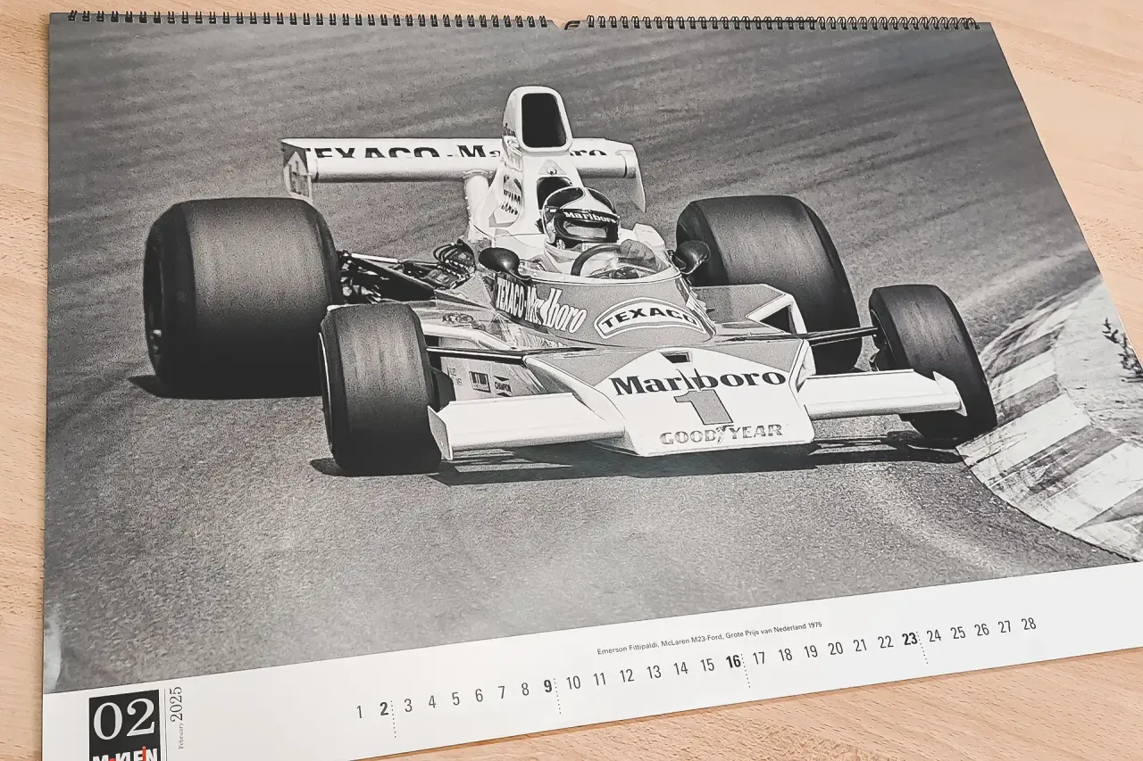 Fórmula 1, endurance, turismo e ralis preenchem as 25 páginas deste calendário. É possível passar horas a apreciar os detalhes de cada imagem como, por exemplo, da grelha de partida dos 1000km de Nürburgring de 1965, onde o número de automóveis de sonho é incrível. E, em primeiro plano, está Nicha Cabral a correr em direcção ao Iso Grifo A3C de fábrica (o primeiro com suspensão traseira independente) que Cabral partilhou com Teodoro Zeccoli mas que, infelizmente, apenas durou cinco voltas.
