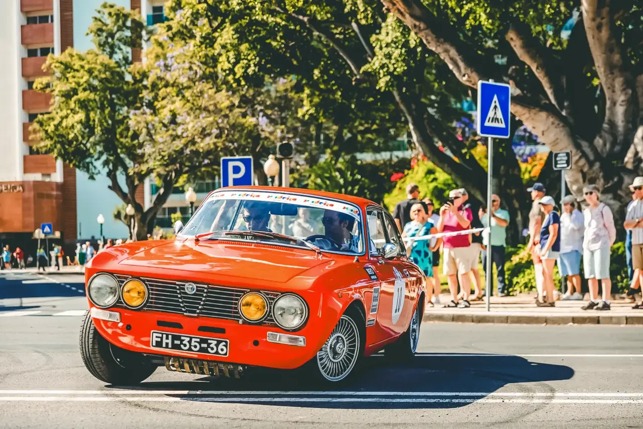 Na manhã de domingo, 57 máquinas alinharam-se para percorrer o traçado histórico desenhado nas ruas do Funchal, para alegria do imenso público que se junta nos passeios, jardins e varandas.