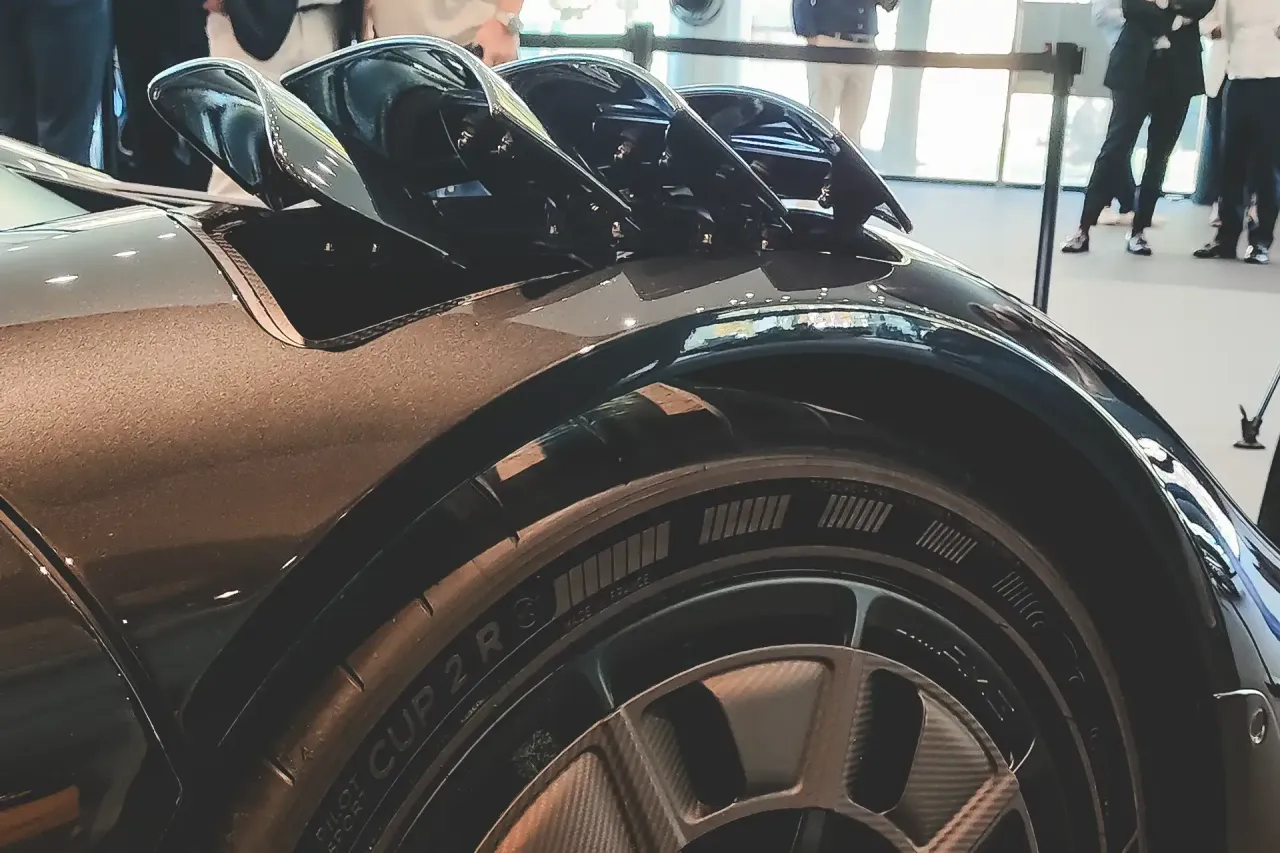 Tudo começa nos materiais. Apesar dos quase 1800kg de peso total, a fibra de carbono é dominante no interior e exterior do One. Mas o que impressiona é a qualidade do acabamento. A construção dos braços da suspensão inboard é autêntica joalharia, assim como as jantes, com cobertura aerodinâmica para menor turbulência e aumento da performance dos gigantescos discos de travão em carbono.