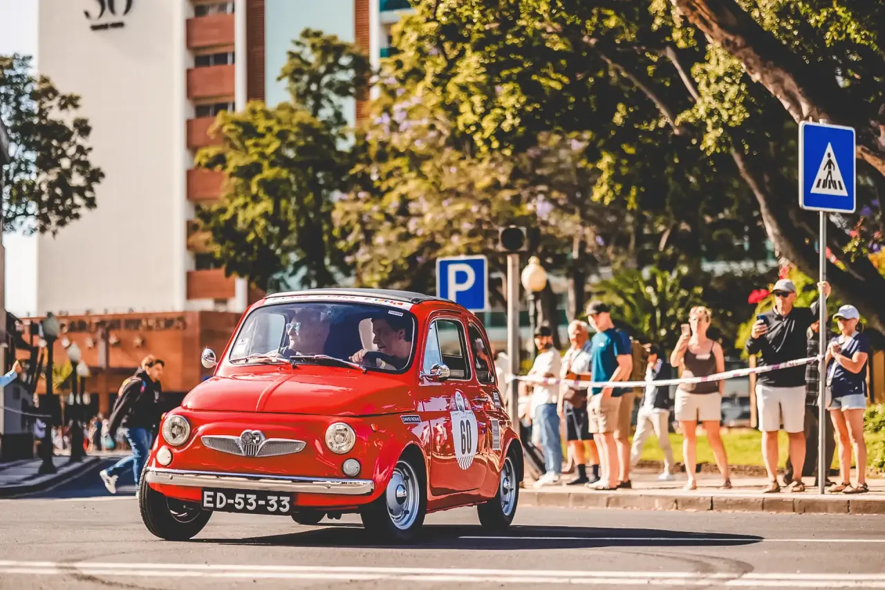 Na manhã de domingo, 57 máquinas alinharam-se para percorrer o traçado histórico desenhado nas ruas do Funchal, para alegria do imenso público que se junta nos passeios, jardins e varandas.