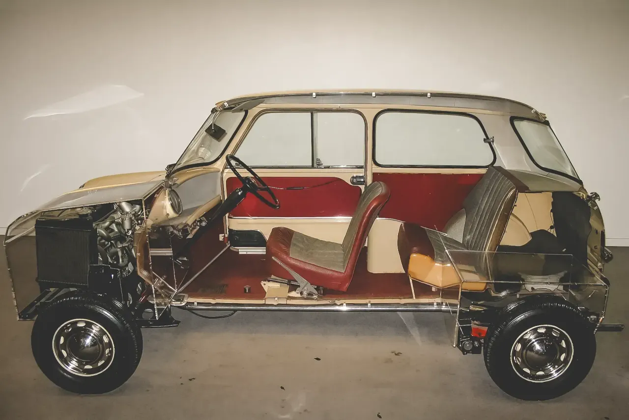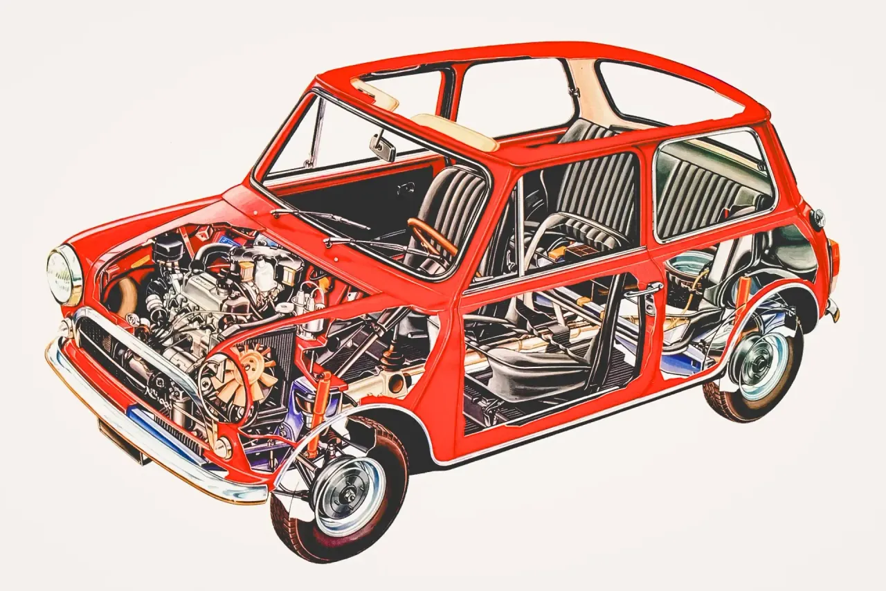 A transmissão dianteira só se tornou compatível com os automóveis citadinos com a solução preconizada por Sir Alec Issigonis. Ao colocar a caixa de velocidades sob o motor, passou a ser possível montar toda a mecânica em posição transversal, mesmo num modelo tão estreito como o Mini.