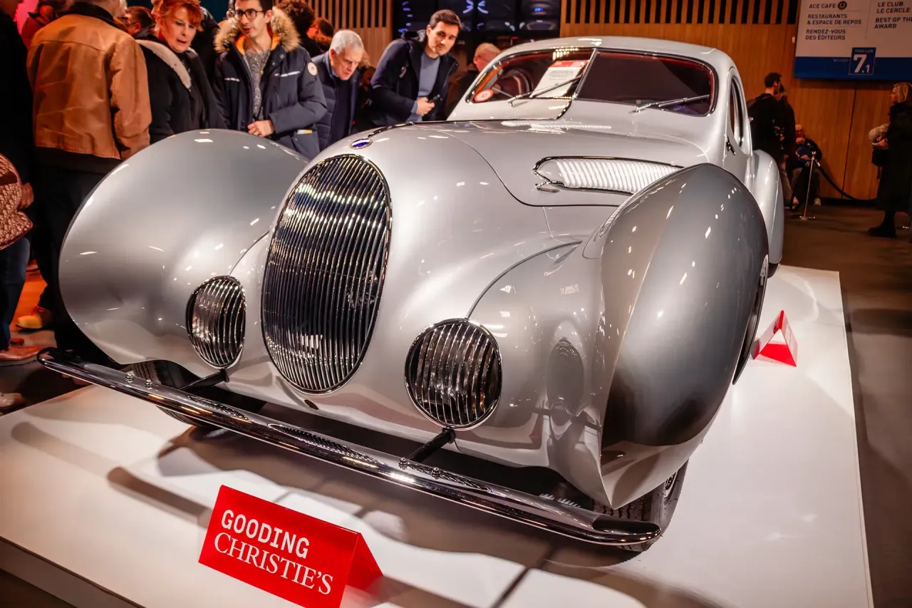 Uma das estrelas do leilão e da Retromobile, o Talbot-Lago T150-C-SS Teardrop Coupe, superou a estimativa mínima ao ser vendido por 6.755.000€, ainda assim quase metade do valor pelo qual tinha sido vendido o mais famoso exemplar deste belíssimo ícone da art-deco.