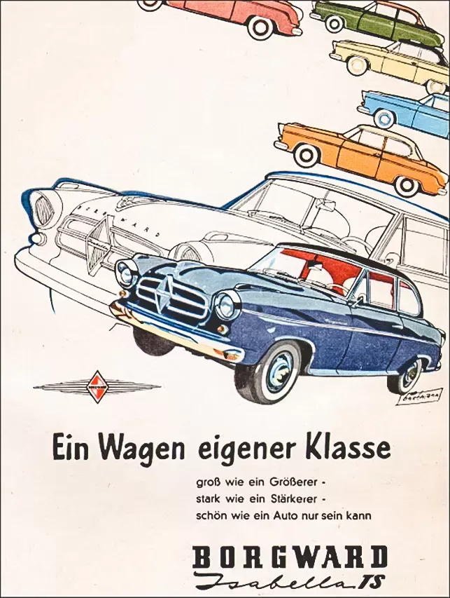 Confortáveis, espaçosos e com um habitáculo luminoso, os Borgward gozaram de muita popularidade mas, apesar disso, a empresa faliu. Diz-se que terá havido um conluio a favor da BMW através de um gestor nomeado pelo estado com assento no conselho de administração de ambas as empresas. Nunca ficou provada essa conspiração, porque o detective Claxon estava ocupado.