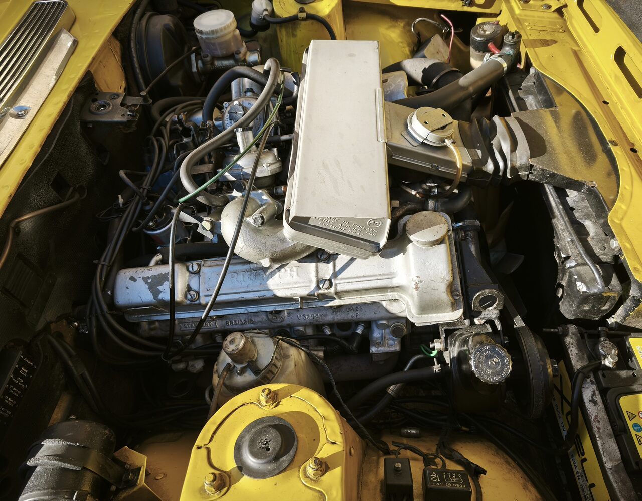 Veículo na singular cor Inca Yellow, que foi alvo de uma re-pintura pouco depois de ser adquirido, mantendo-se até aos dias de hoje com um brilho ainda intenso, apesar de ter algumas correções a fazer. A capota Preta de lona mohair, foi também colocada na mesma altura da intervenção na pintura, adquirida nova e original a uma conceituada empresa inglesa especialista em peças da marca Triumph, não apresentando atualmente sinais de grande desgaste e está completamente estanque, tendo somente um pequeníssimo corte no vidro de mica da janela esquerda da capota.
