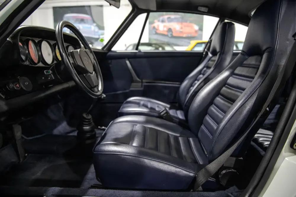 Este soberbo Porsche 911 Carrera 2.7 MFI foi entregue novo em Itália em setembro de 1973. Tem acabamento em Grand Prix White sobre couro sintético azul e possui uma caixa manual de 5 velocidades e as icónicas jantes Fuchs também pintadas de azul.