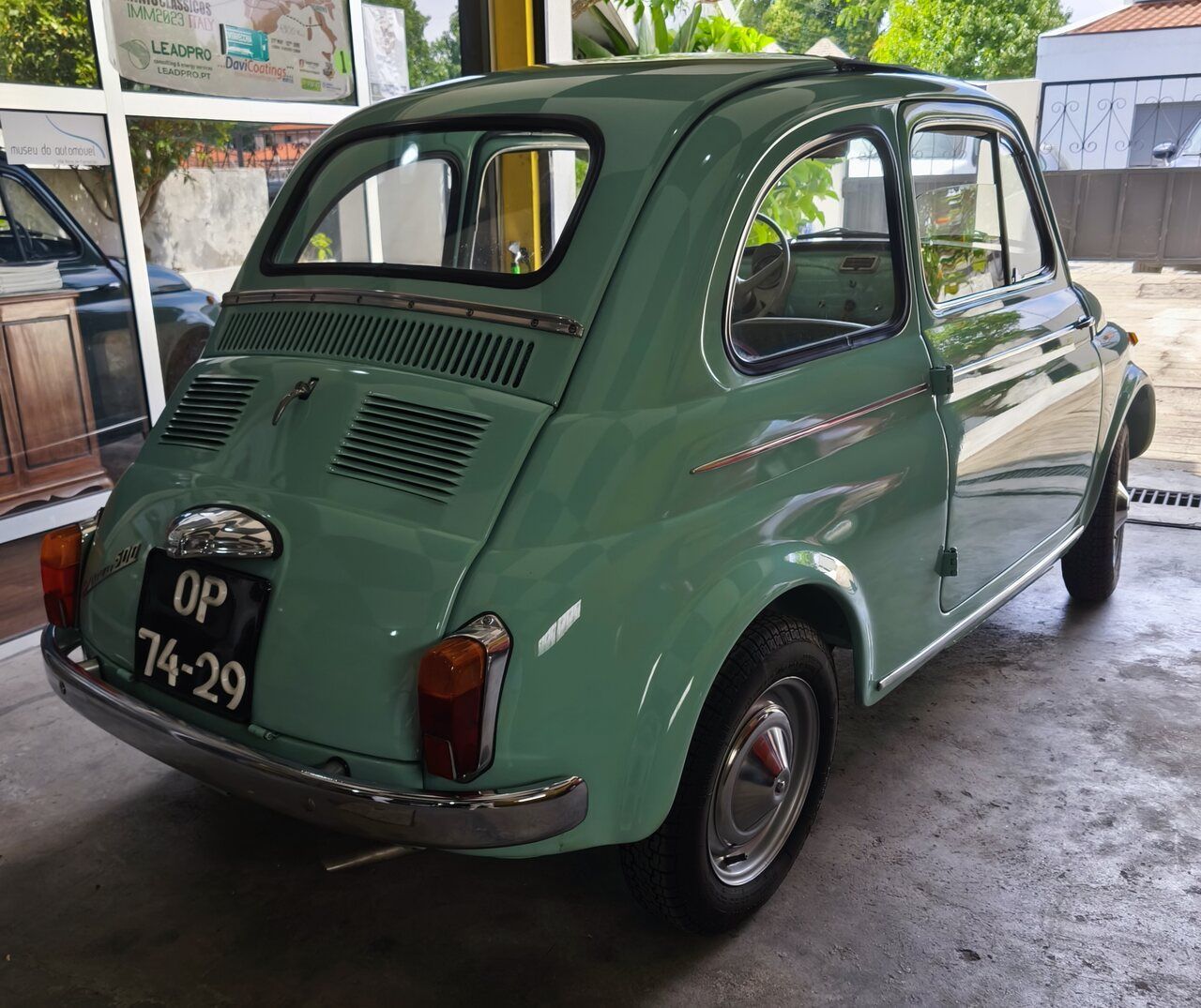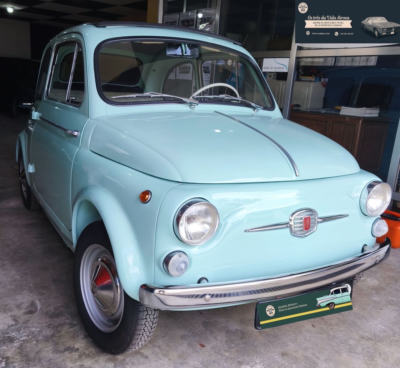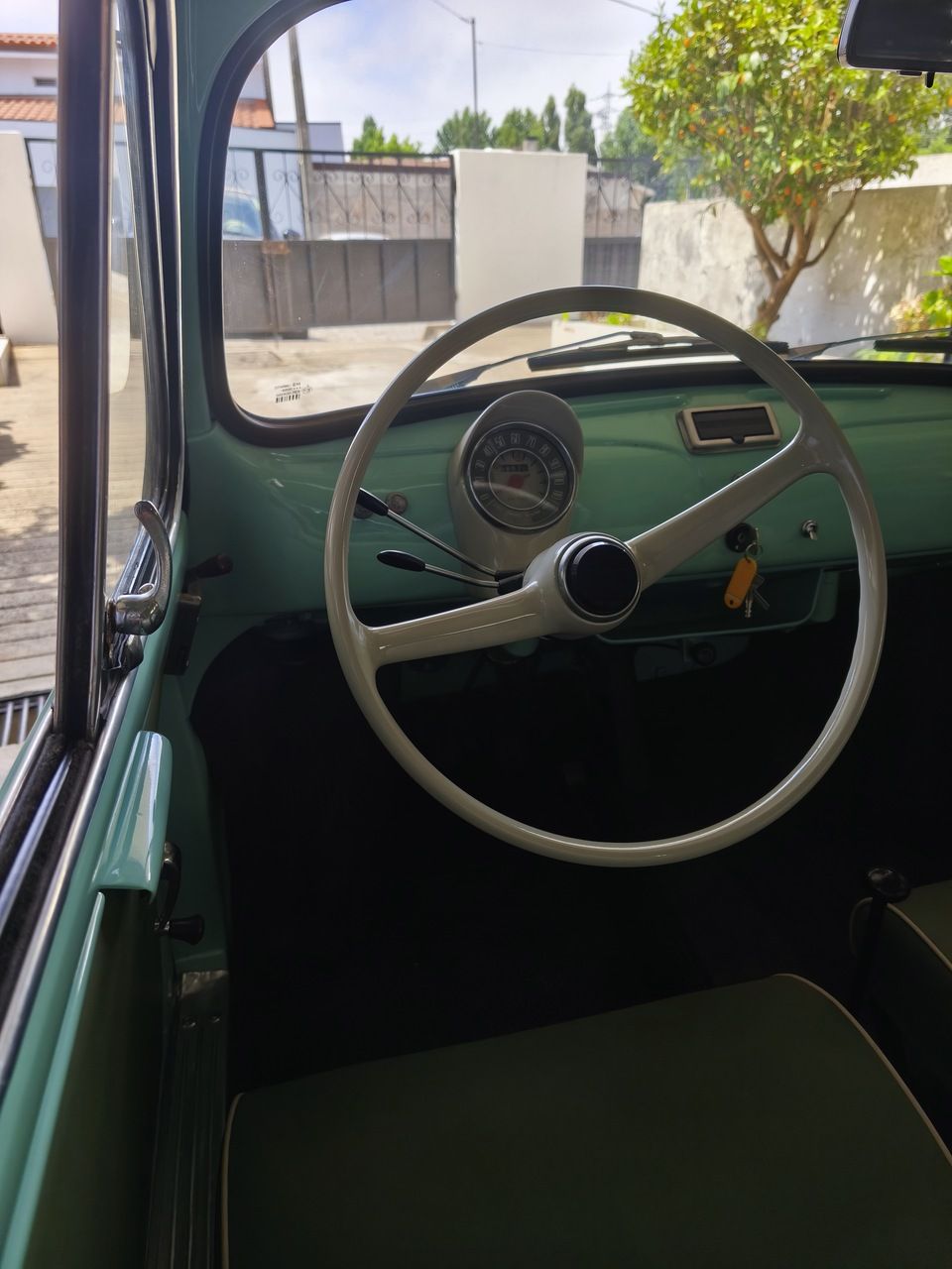 Deslumbrante exemplar do icónico Fiat 500 D de 1961, apresentado na encantadora cor original Verde Chiaro (ref. 372), com interiores personalizados em verde e capota em cinza, respeitando a configuração original da época e em perfeito contraste.