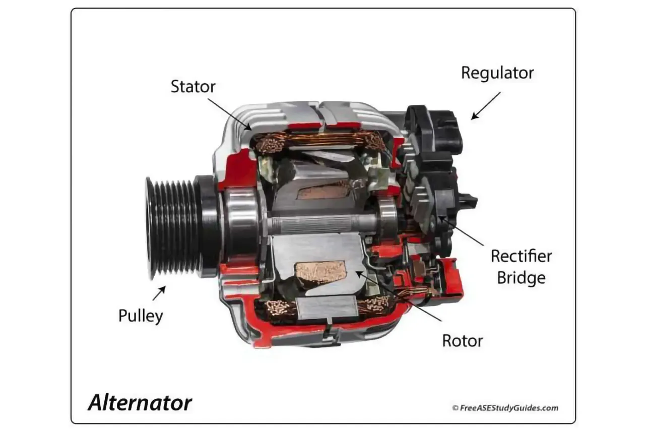 O alternador funciona de forma inversa. Três bobinas distintas estão montadas na carcaça, formando o estator (do termo “estacionário”). A parte rotativa do alternador chama-se rotor, no qual existem enrolamentos de cobre alimentados por corrente proveniente da bateria através de escovas e de dois anéis colectores (slip rings), transformando-o num electroíman em rotação. À medida que o rotor gira, o campo magnético também roda, e a corrente induzida nos enrolamentos do estator alterna de sentido — ou seja, trata-se de um gerador de corrente alternada.