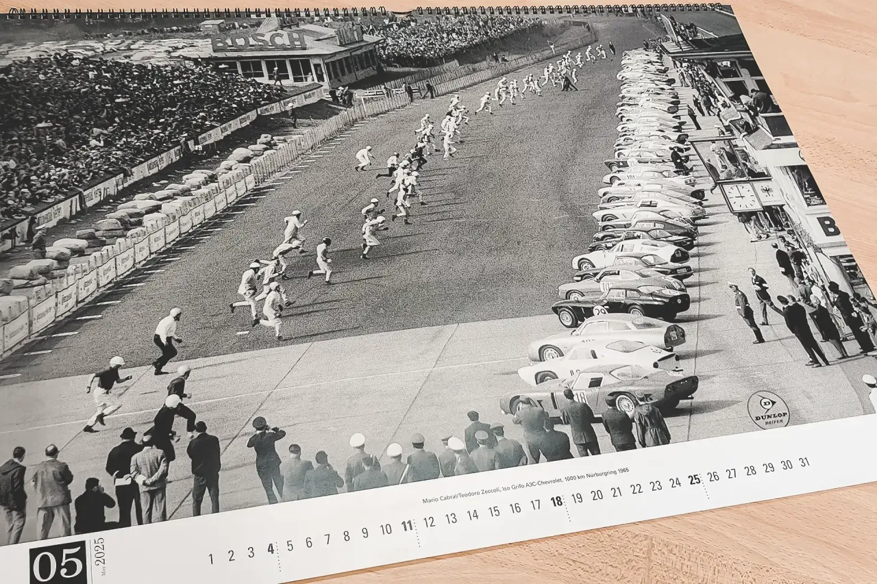 Fórmula 1, endurance, turismo e ralis preenchem as 25 páginas deste calendário. É possível passar horas a apreciar os detalhes de cada imagem como, por exemplo, da grelha de partida dos 1000km de Nürburgring de 1965, onde o número de automóveis de sonho é incrível. E, em primeiro plano, está Nicha Cabral a correr em direcção ao Iso Grifo A3C de fábrica (o primeiro com suspensão traseira independente) que Cabral partilhou com Teodoro Zeccoli mas que, infelizmente, apenas durou cinco voltas.