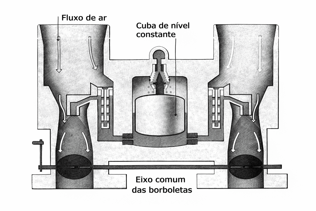 Uma cuba comum de nível constante fornece quantidades equivalentes de gasolina a cada corpo que tem seus próprios difusores, tubos de emulsão, pulverizadores e circuito de ralenti. As duas borboletas estão normalmente montadas no mesmo eixo e são acionadas simultaneamente por um mesmo tirante.