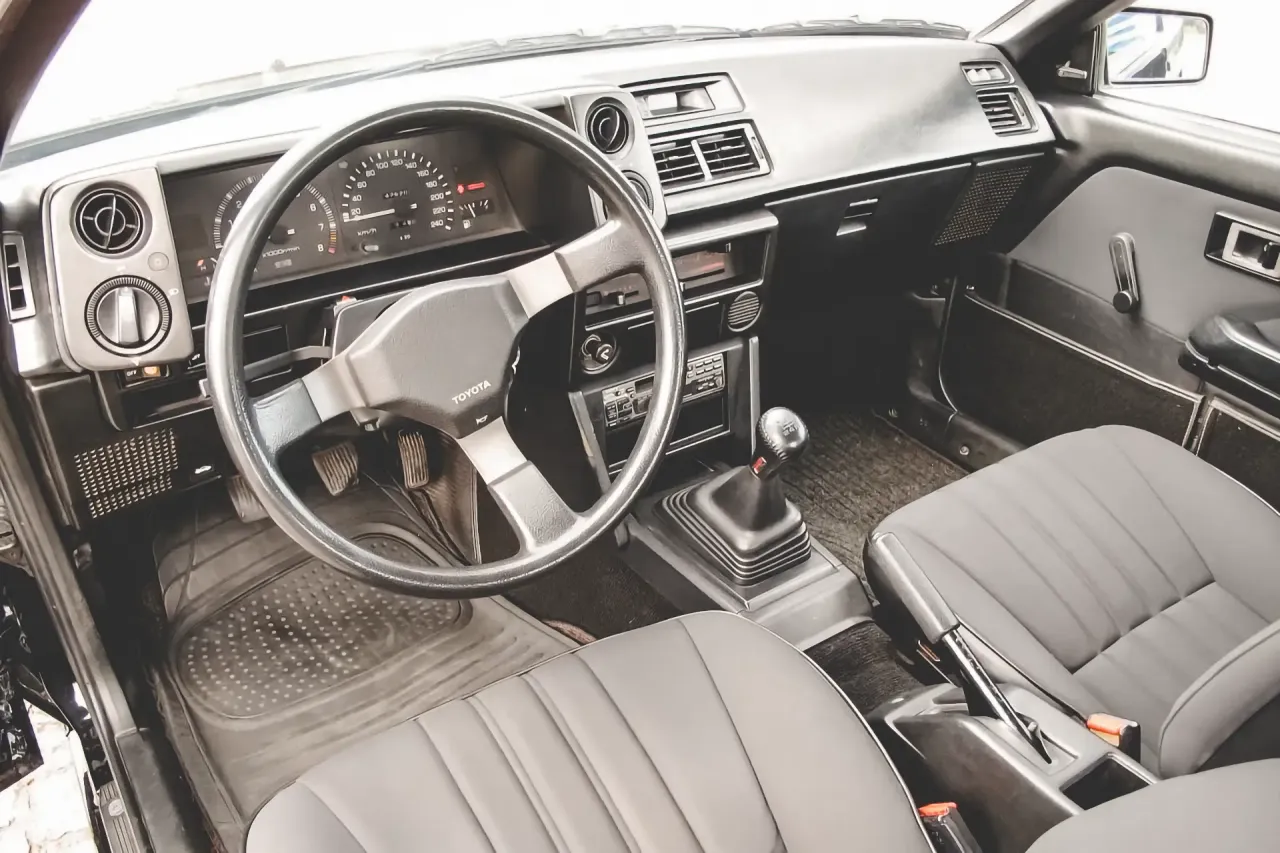 Este Corolla AE86 é um exemplar da segunda fase, que se distingue desde logo pela secção frontal, em que a grelha tradicional deu lugar a um painel plástico vidrado, com uma abertura para refrigeração.