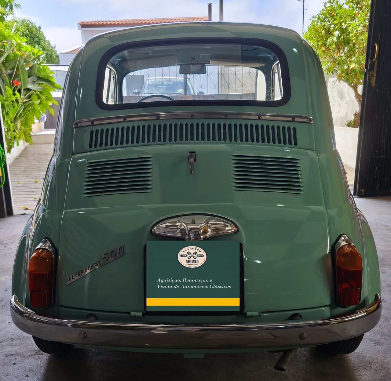 Deslumbrante exemplar do icónico Fiat 500 D de 1961, apresentado na encantadora cor original Verde Chiaro (ref. 372), com interiores personalizados em verde e capota em cinza, respeitando a configuração original da época e em perfeito contraste.