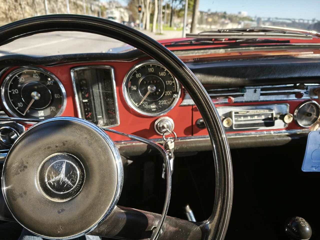 Muito bem mantido até a data e com toda a manutenção em dia, este exemplar de 1965 de cor vermelha, ainda com um bom nível de brilho na pintura, dispõe de capota de lona preta e o característico hard-top, estilo “pagode”, pintado na cor da carroçaria. Veículo com interiores em pele preta e o tradicional tablier de madeira ainda em estado muito aceitável. O veículo encontra-se em muito boa condição de preservação.