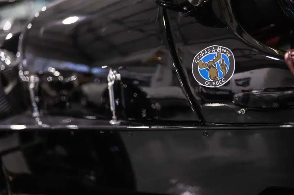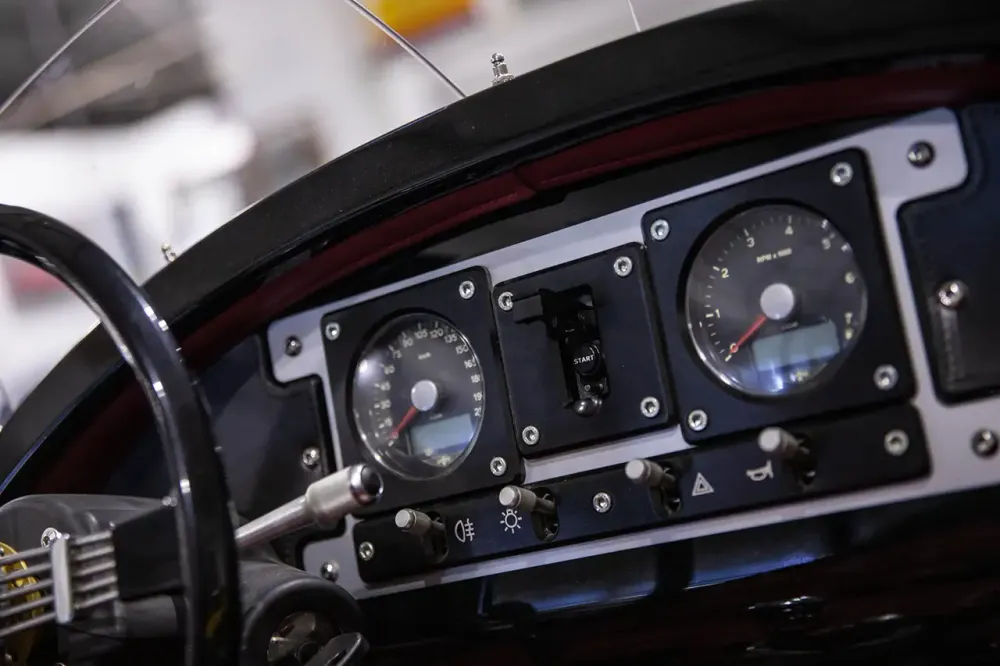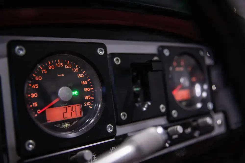 Apesar de não ter portas entrar no cockpit não requer muita ginástica. A ignição é simples e moderna, e apesar do tablier reminiscente de um avião, basta pressionar um botão para acordar o motor V-Twin de 82 Cv. O bloco, da americana S&S, ao estilo Harley-Davidson, também contribui para a aura aeronáutica, com uma sonoridade típica de um biplano antigo.