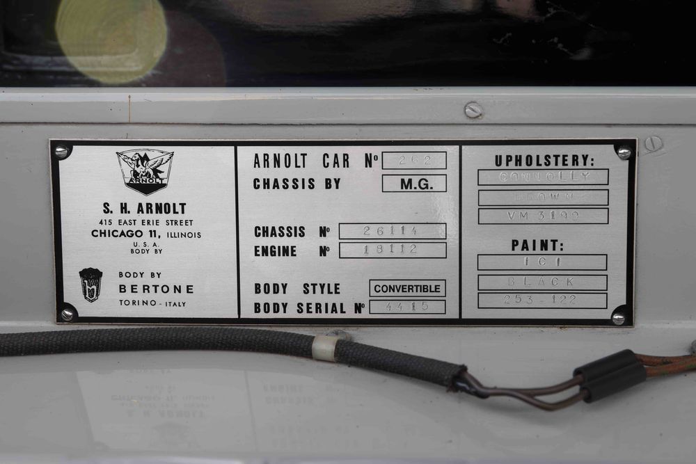 This 1953 Arnolt-MG Convertible, with number 262, was shipped on the SS Kollbrynn with Arnolt-MG convertibles 256, 259, 265, 268 and 271, and coupes 258, 260, 261, 263 and 264, arriving in Chicago via the Great Lakes on October 13, 1953. The initial purchaser was Auto Imports Ltd., Indiana, delivered on 21 July 1954, invoice 1644. Its history is well documented with lots of photographs and invoices, being the oldest invoice for a $2000 service service in 1976