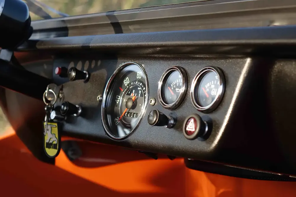 Every detail of this Meyers Manx reflects a blend of vintage charm and modern craftsmanship. From its striking silhouette and meticulously «Light Red Orange» (RAL 2008) finished body to its custom interior, this buggy exudes the fun character and charisma reminiscent of a bygone era.
