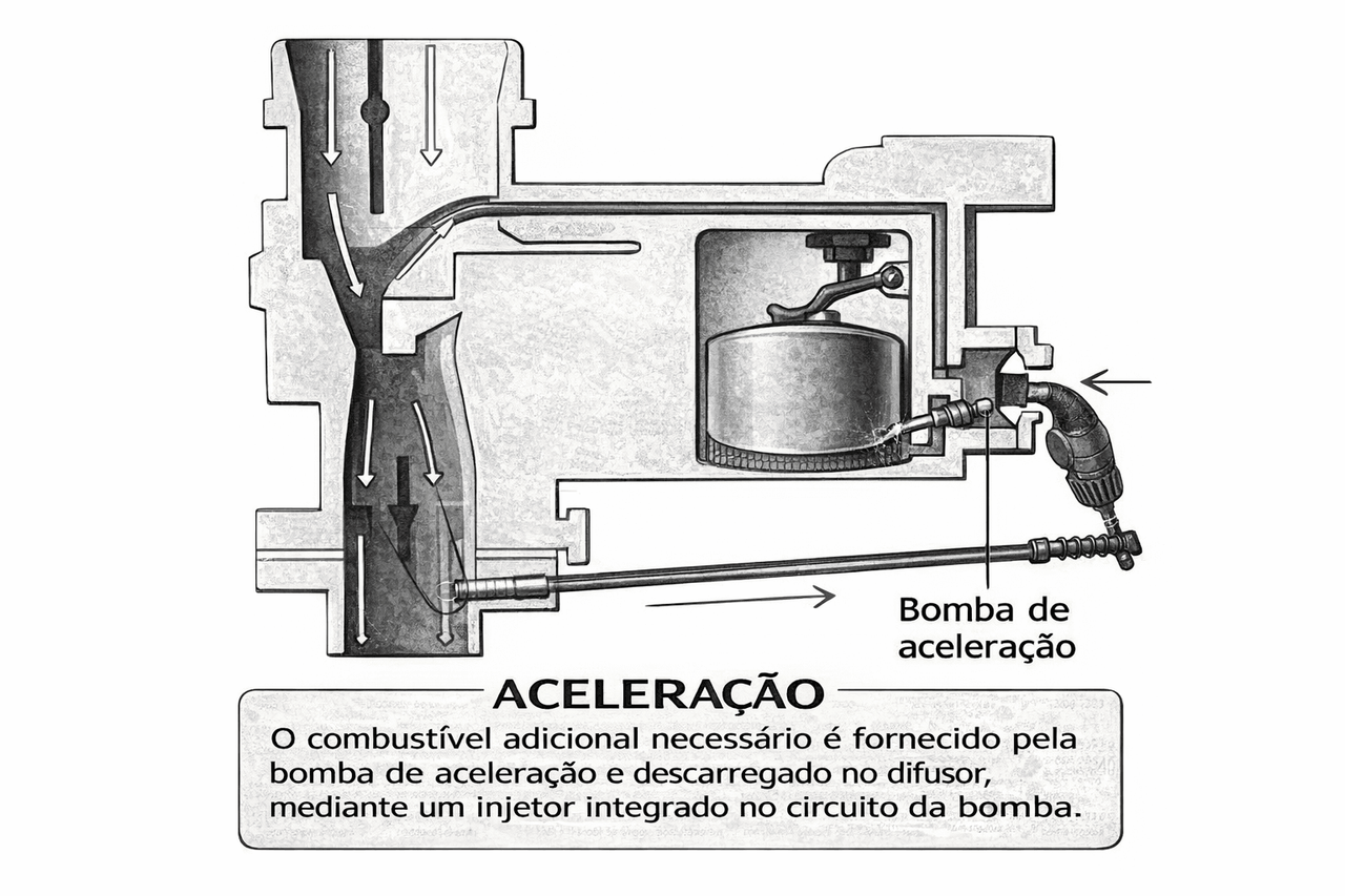 Para fornecer o combustível adicional necessário na aceleração e nas aberturas súbitas da borboleta existe uma bomba de aceleração mecânica. Esta consiste num poço (ou câmara), cheio de combustível e num pistão acionado por uma mola ou um diafragma ligado à borboleta. Quando esta se abre, o combustível é descarregado no difusor por ação do pistão e através de um injetor integrado no circuito da bomba.
