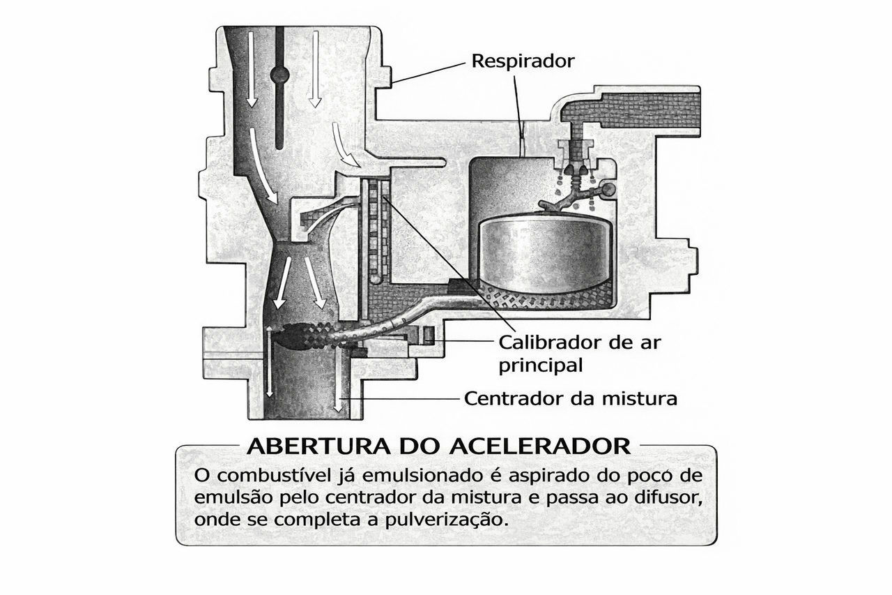 Ao pisar no pedal do acelerador, abre-se a borboleta e aumenta o fluxo de ar através do pulverizador de compensação de ar. Em consequência do aumento da depressão no difusor, a gasolina depois de passar pelo pulverizador principal, faz subir o nível no poço de emulsão e, ao mesmo tempo, o ar admitido no calibrador principal emulsiona a gasolina que será posteriormente pulverizada no difusor. Simultaneamente, diminui a depressão no furo de descarga do ralenti e cessa o fluxo de combustível nesse ponto.