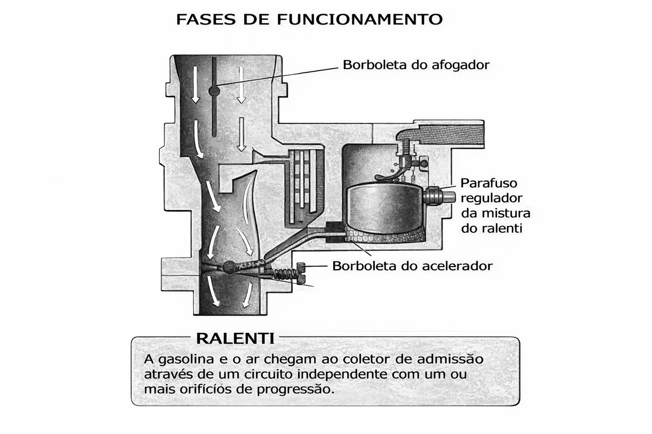 Com o motor já quente e funcionando ao ralenti, o movimento dos pistões provoca uma depressão no colector de admissão. Como a borboleta do acelerador está praticamente fechada, esta depressão atua sobre o pulverizador através de mínimo ou ralenti, aspirando através deste a gasolina da parte inferior do poço de emulsão fazendo descer o seu nível. O ar necessário para se misturar com a gasolina é absorvido por um calibrador de ar mínimo.