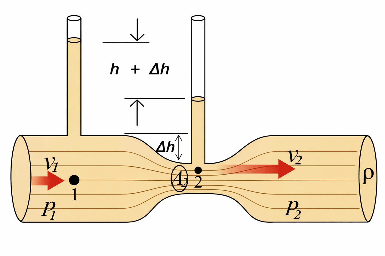 O efeito Venturi é explicado da seguinte forma. Se o caudal de um fluido é constante, mas a secção diminui, necessariamente a velocidade aumenta após atravessar esta secção.