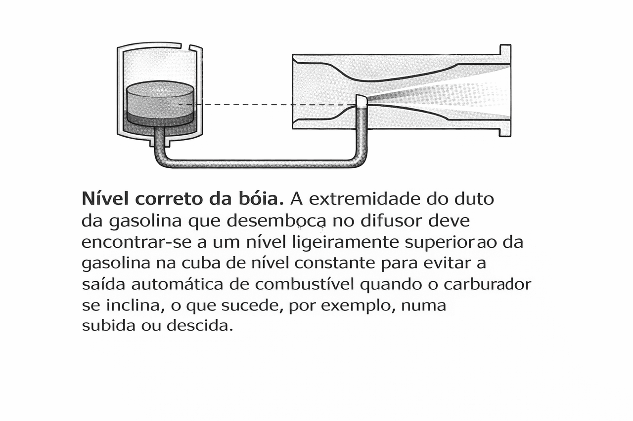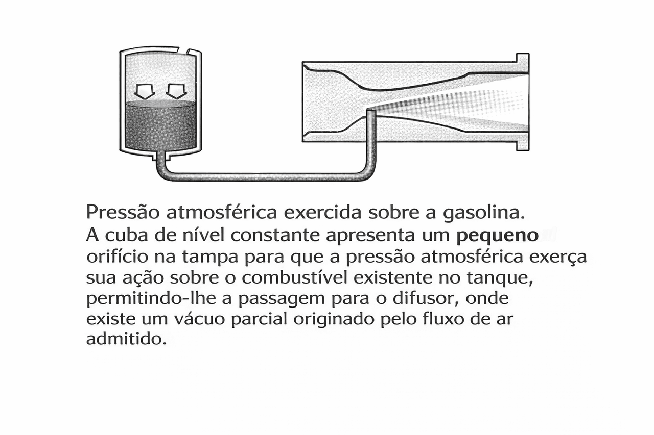A gasolina na cuba de nível constante do carburador mantém-se, como o próprio nome indica, sempre ao mesmo nível, graças a uma válvula accionada pela bóia. A extremidade do condutor de gasolina que desemboca no difusor deve ficar mais alta que o nível da gasolina na cuba de nível constante, para evitar a saída de combustível quando o automóvel se inclina, como acontece, por exemplo, numa subida ou descida. Isto quer dizer que a gasolina tem de subir ligeiramente (cerca de 6mm) antes de se misturar com o fluxo do ar no difusor. A sucção criada pela depressão é suficiente para elevar a gasolina acima do pulverizador e para a introduzir no difusor sob forma de pequenas gotas.